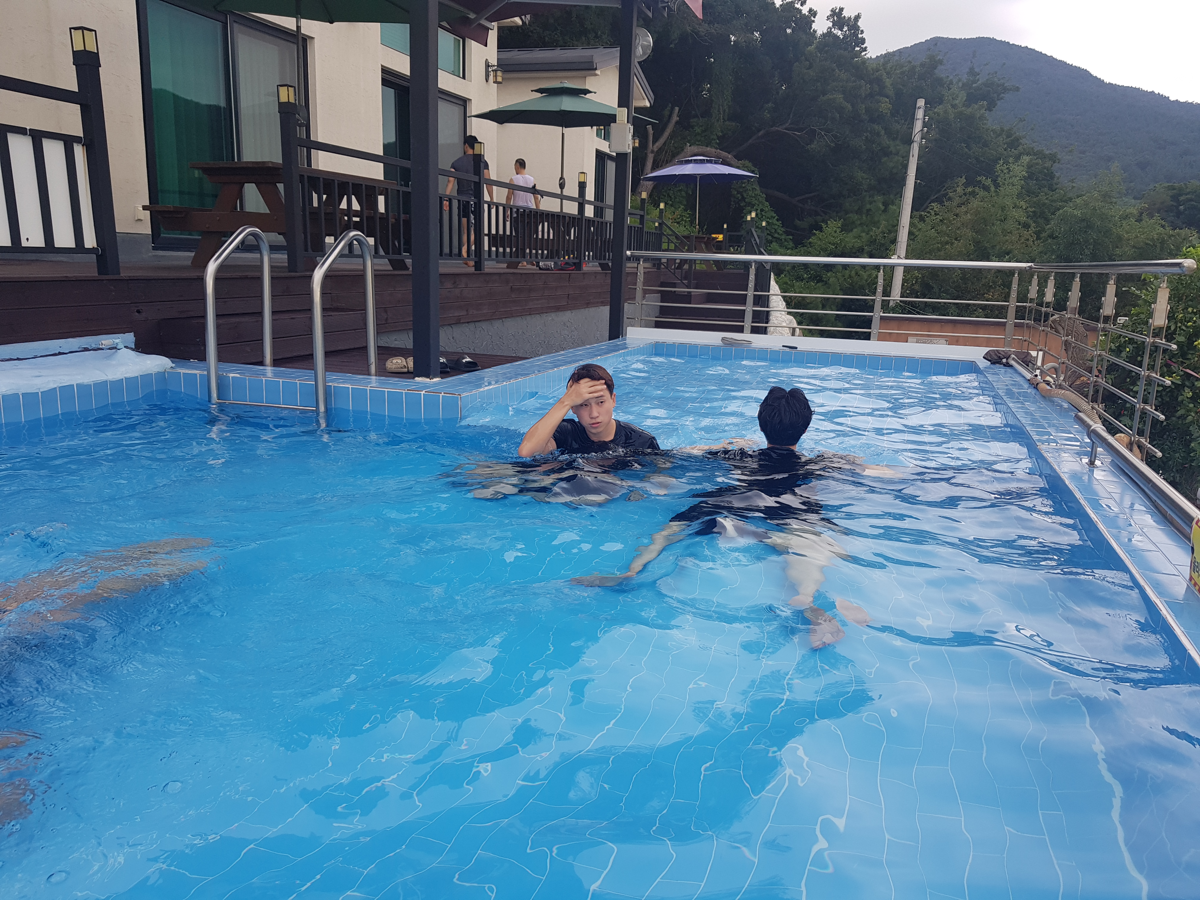 3시쯤 펜션에 도착하자 마자 역시 에너지 넘치는 우리 가족은 온수풀로 뛰어들었다. 온수풀인데 사실 미지근했다. 그리고 사진보다 멋있지도 않았지만 나름 15m 정도로 큰 편이고 물놀이 하기에는 충분했다.
