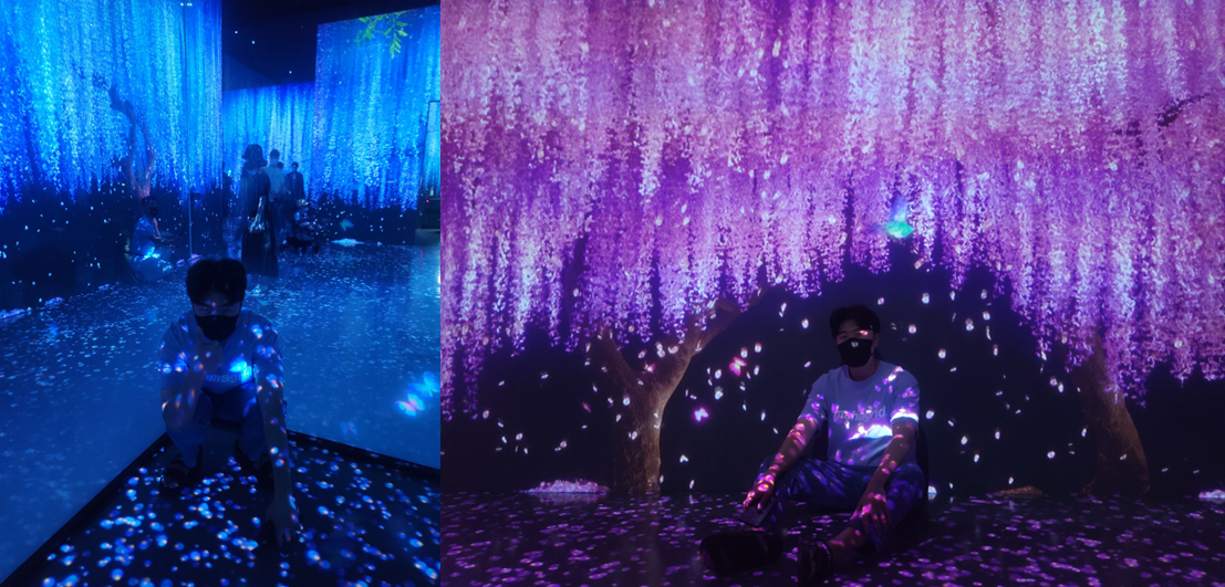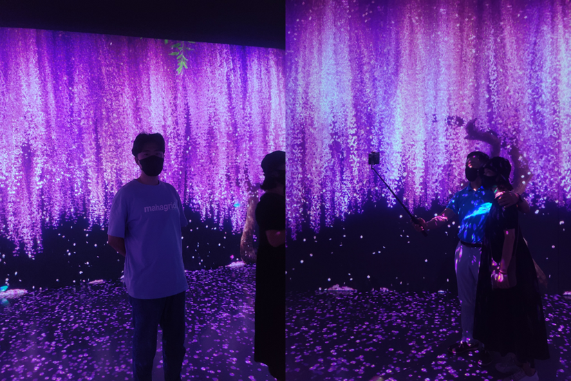 처음 들어가면 엄청난 양의 꽃들이 보인다. 그런데 아무래도 스크린에 빛을 쏴서 형상을 만들기 때문에 사진을 찍을 때 빛이 인물을 방해하는 단점이 있었다.