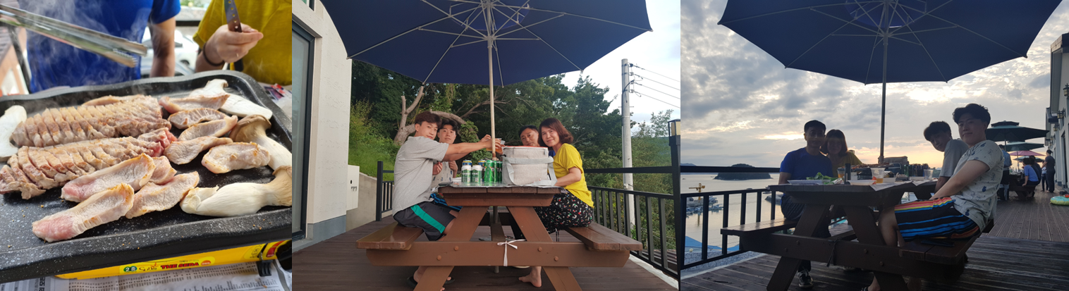수영이 끝나고 먹는 고기와 맥주는 정말 천국의 맛이었다. 숯불로 하는 바베큐는 2만원 추가라 따로 가스 버너를 가져갔는데 오히려 더 편하고 맛있게 고기를 먹을 수 있었다. 역시나 우리 가족은 돼지라 삼겹살로 만족하지 못하고 햇반 6개에 부대찌개에 라면사리까지 추가해서 모두 클리어했다. 소주 없이 맥주만 먹었더니 배가 터질 것 같았지만 너무 만족스러운 저녁 식사였다.