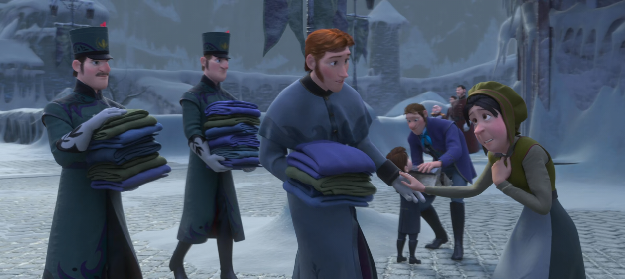 | B | bald guy | Prince Hans! Are we expected to just sit here and freeze while you give away all of Arendelle's tradable goods? |