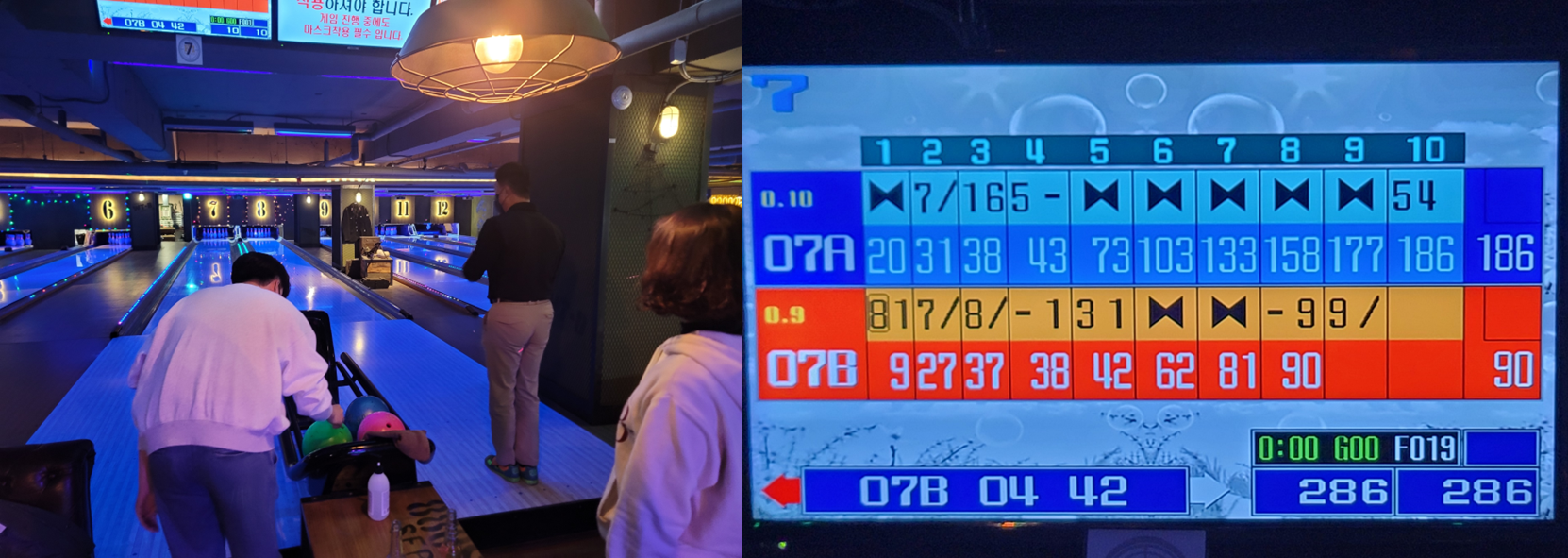 숙소 건물에 볼링장이 있어서 2대2로 한판쳤다.